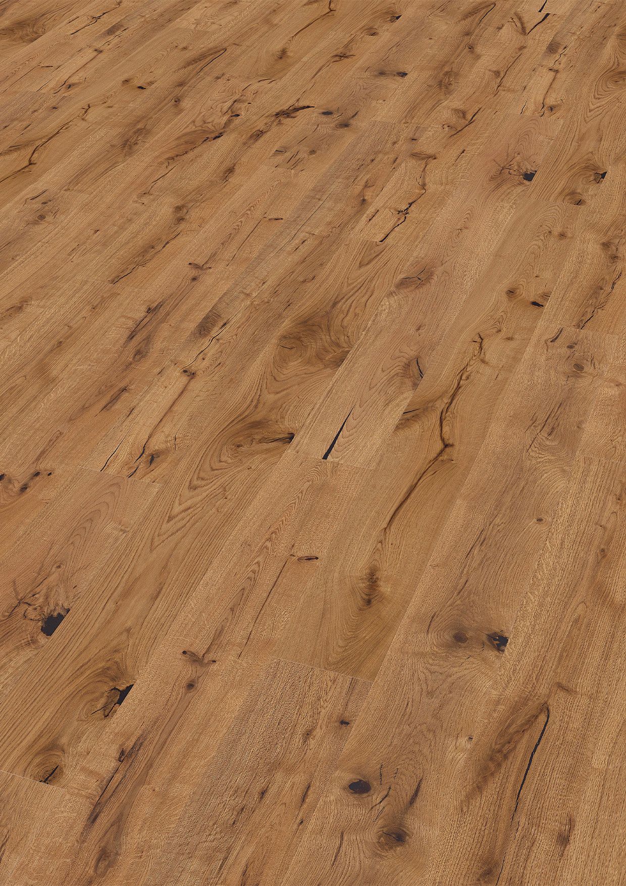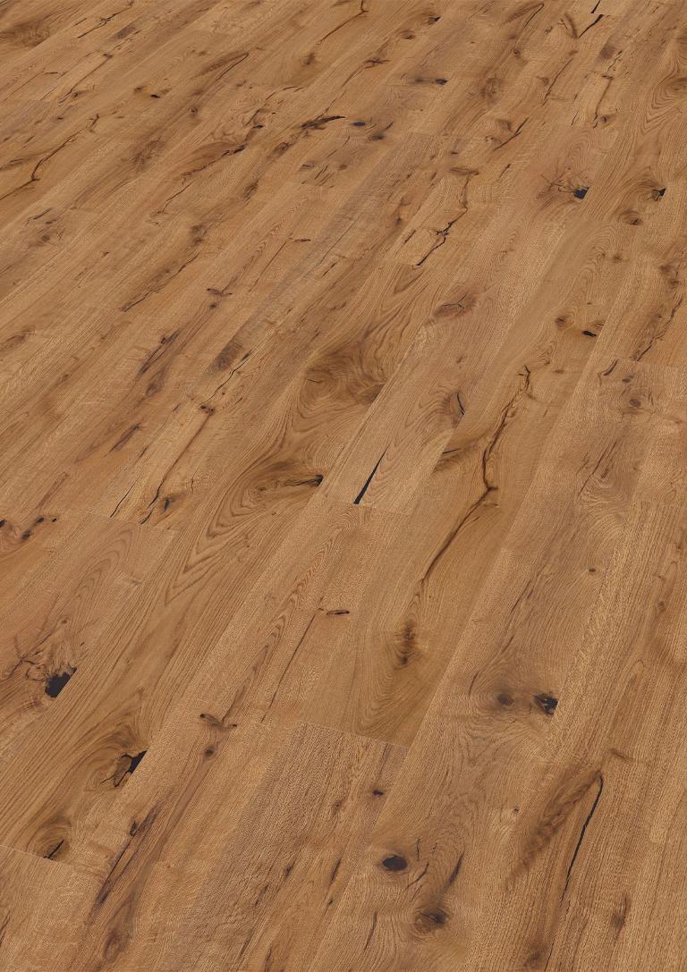 Hochwertiger Boden mit längsseitiger Fase und modernem Clicsystem (uniclic® längsseitig, Drop-Down stirnseitig). 3-schichtiger Aufbau mit massiver Holzmittellage und ca. 4 mm Nutzschicht für hohe Stabilität.