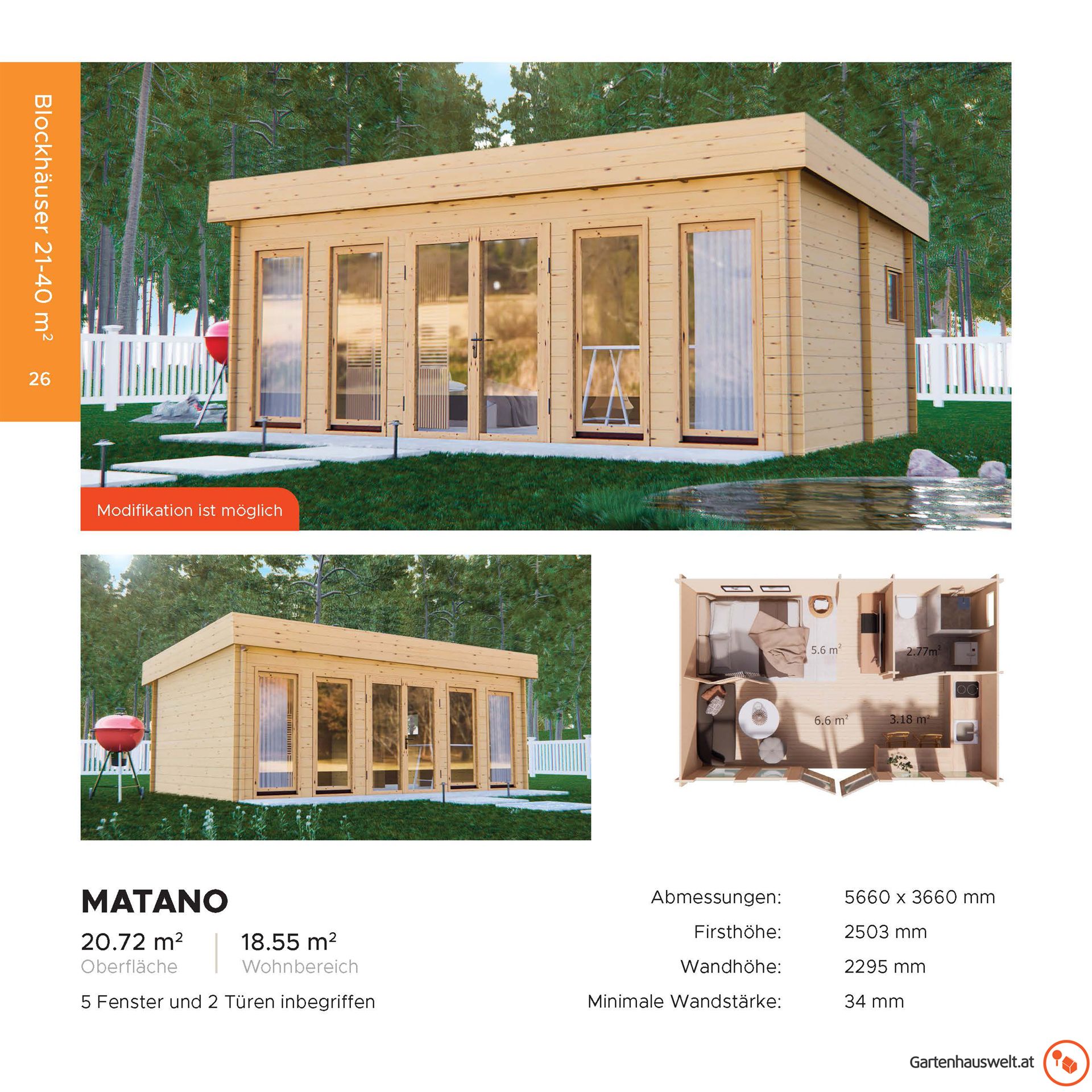 Gartenhaus MATANO Oberfläche: 20,72 m2 Wohnbereich: 18,55 m2 5 Fenster und 2 Türen inbegriffen Abmessungen: 5660 x 3660 mm Firsthöhe: 2503 mm Wandhöhe: 2295 mm Minimale Wandstärke 34 mm
